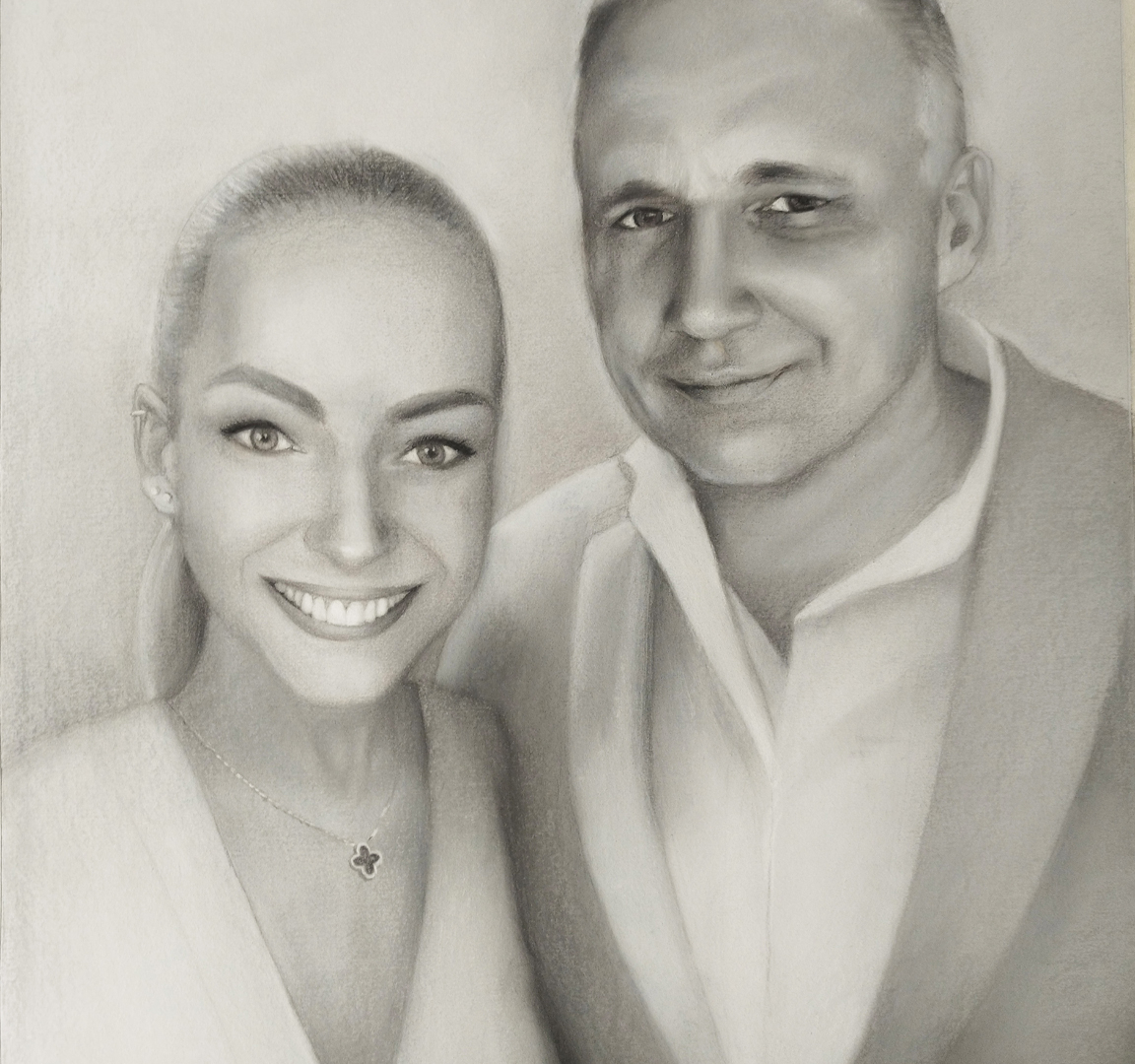 A portré fakeretre feszített alapozott vászonra készül olaj vagy akrilfestékkel. Az elkészült portrét lelakkozom és száradás után vastag kartonok közé helyezve csomagolom be, ami biztos védelmet jelent a szállítás során.